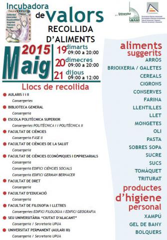 Benvolguts amics, us recordem que els pròxims dies 19, 20 i 21 de Maig es procedirà a la Octava Recollida Mensual d'Aliments del present curs acadèmic 2014-15.